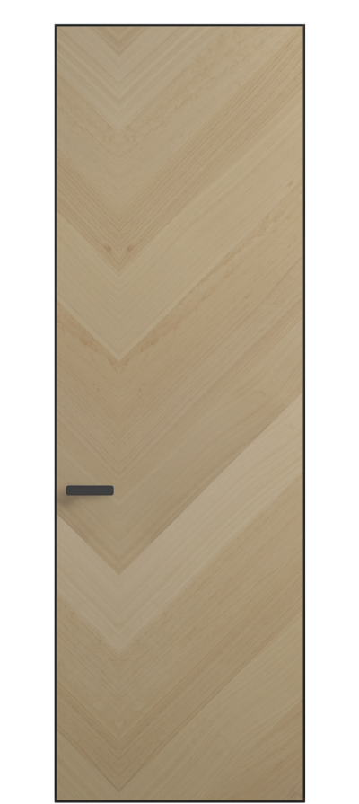 Полотно Рифт в скрытом алюминиевом коробе становится полноценным элементом декора. В коллекции представлено 9 моделей дверей в высоте до 3 метров. Рисунок раскладки шпона варьируется от простого до сложного. «Рубашка» для каждого полотна подбирается вручную по цвету, текстуре и фактуре.
